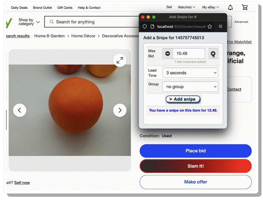 Install our browser extension to snipe directly from an eBay item page.